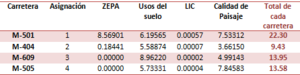 Una vez realizado el coeficiente de afección de cada carretera según cada aspecto medio-ambiental, se han trasladado los resultados a una tabla. Todos estos criterios están evaluados en una escala del 0 al 10, siendo el valor 10 la máxima afección al territorio y 0 la mínima posible. Los resultados se muestran en la siguiente tabla: