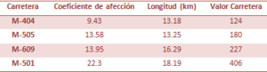 La tabla está ordenada de mayor a menor afección. Y el valor de de la carretera, se ha calculado multiplicando el coeficiente de afección por la longitud de la misma. Con estos resultados se ha llegado a las siguientes conclusiones: