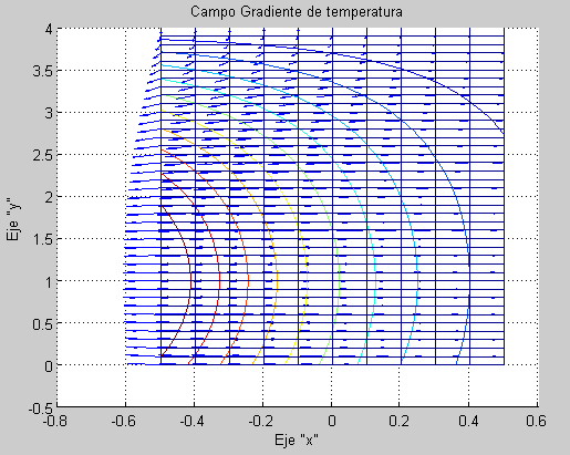Campo vectorial Gradiente de la función Temperatura (Campo escalar). Se aprecia que las direcciones de los vectores del campo gradiente son ortogonales a las curvas de nivel de la temperatura en proyección ortogonal.
