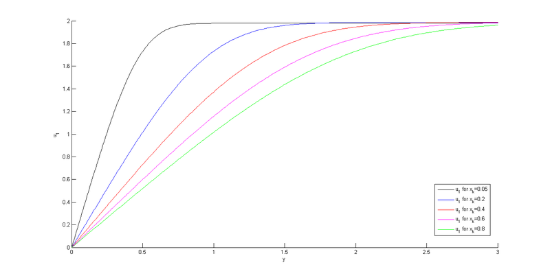 Once we have numerically calculated the [math]f( \eta)[/math] we proceed to calculate the horizontal component of the fluid velocity [math] u_1 [/math]: