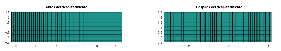 De igual forma, la representación de las deformaciones de una placa 2D siguiendo un campo vectorial [math] \vec u [/math] puede representarse siguiendo la definición de campo vectorial. Siguiendo con el ejemplo anterior, dichas deformaciones pueden representarse en programas como MatLab, ejemplificado con el código: