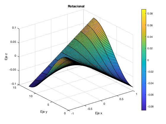 En primer lugar dibujamos el mallado de nuestra placa rectangular plana para representar los puntos interiores del sólido. Tomamos los ejes del rectángulo [math](x, y)∈[-1, 1] × [0, 12][/math] y como paso de muestreo h = 2/10 para las variables x e y. Se han utilizado los comandos axis() y meshgrid() en MATLAB.