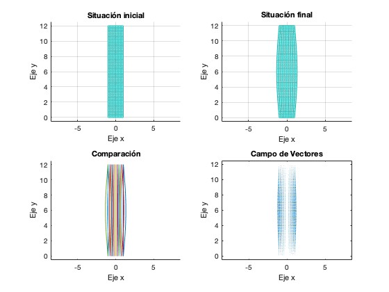 Usando el comando subplot(), hemos realizado una representación de ambas situaciones; tanto la inicial donde la placa no sufre ninguna deformación, como la final con el campo actuando, y finalmente una representación y comparación de ambas.