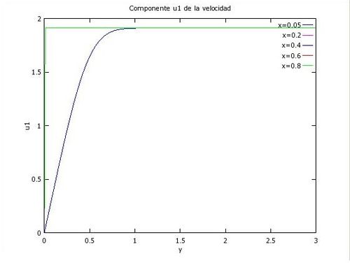 Vamos a calcular dicha componente derivando y utilizando la regla de la cadena: [math]u_1=\frac{\partial \psi}{\partial y}=\frac{\partial }{\partial y}(\sqrt[]{\nu u_0 x} f(\eta))= \sqrt[]{\nu u_0 x} \frac{\partial f(\eta)}{\partial y}=\sqrt[]{\nu u_0 x} \frac{\partial f(\eta)}{\partial \eta} \frac{\partial \eta}{\partial y} [/math] Sabiendo que la función [math] \eta(x,y) es: \eta = y \sqrt[]{ \frac{u_0}{\nu x}}[/math] Nos queda la ecuacion diferencial: [math]u_1=\sqrt[]{\nu u_0 x} \sqrt[]{\frac{u_0}{\nu x}} f’(\eta)=u_0 f’(\eta)[/math] Ahora procedemos a resolverla por el metodo Runge-Kutta 4 para los valores [math]y \in (0,3)[/math] y [math]x \in \{0.05, 0.2, 0.4, 0.6, 0.8\}[/math]. Este programa nos permite sacar la grafica de los valores de [math]u_1(x_k,y)[/math] para dichos valores.