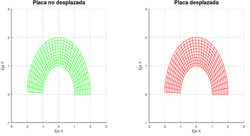 Ya tenemos el campo vectorial del desplazamiento, por lo que vamos a poder observar la deformación en la placa antes y después de la acción del campo \(\vec u\):