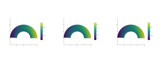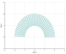 Consideramos una placa plana que ocupa la mitad de un anillo circular centrado en el origen y comprendido entre los radios 1 y 2, en el plano y ≥ 0. En ella vamos a suponer que tenemos definidas dos cantidades físicas: la temperatura \(T(x,y)\), que viene dada por [math]T(x, y) = log((x − 3)^2 + 2)[/math], y los desplazamientos \(\vec u(x,y)\) producidos por la acción de una fuerza determinada. De esta forma, si definimos \(\vec r\)0(x,y) el vector de posición de los puntos de la placa en reposo, la posición de cada punto \((x,y)\) de la placa después de la deformación viene dada por \(\vec r\)(x, y) = ~\(\vec r\)0(x, y) + ~\(\vec u\)(x, y). Vamos a suponer que la fuerza aplicada sobre la placa ha provocado un desplazamiento de los puntos de la misma dado por el vector de desplazamientos [math]\vec u(ρ, θ)=\frac{ρ − 1}{5} sin(θ)~[/math]\(\vec e\)θ.