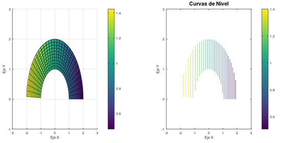 Una vez tenemos definido el mallado (que representa al propio sólido), pasamos a la representación de la temperatura a partir de la función [math]T(x, y) = log((x − 3)^2 + 2)[/math]. Para llevarla a cabo, representamos el campo escalar. Además, hemos definido una serie de curvas de nivel para poder apreciar mejor el cambio de temperatura a lo largo de la placa.