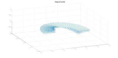 El campo de fuerzas que actúa sobre la placa sigue la siguiente fórmula F = −∇ · σ. En la gráfica podemos apreciar claramente cómo actúa sobre el sólido este campo y podríamos intuir qué desplazamiento y deformación sufriría.