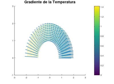 El siguiente paso después de observar el campo de la temperatura es calcular el gradiente de esta misma función y dibujarlo como campo vectorial. El cálculo del gradiente consiste en: