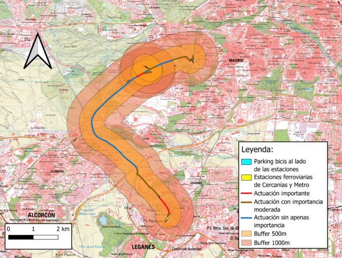 Finalmente, se propone la construcción de una senda ciclable sobre la traza del ferrocarril, conectando así Alcorcón y Leganés no sólo con Cuatro Vientos, sino también con el Anillo Verde Ciclista que queda a pocos metros de dicha estación y permite la conexión con otros carriles bici de la capital. Además, se propone también la construcción de aparcamientos para bicicletas en las inmediaciones del recorrido de la senda ciclable, así como su interacción con los principales nodos de transporte público (estaciones de Metro de Madrid y Cercanías principalmente) para fomentar la movilidad en transporte público. Se calcula también el perfil longitudinal de la senda ciclable propuesta mediante la herramienta Profile Tool de QGIS, haciendo uso del Modelo de Elevación del Terreno.