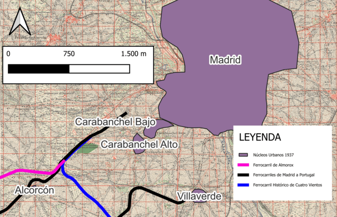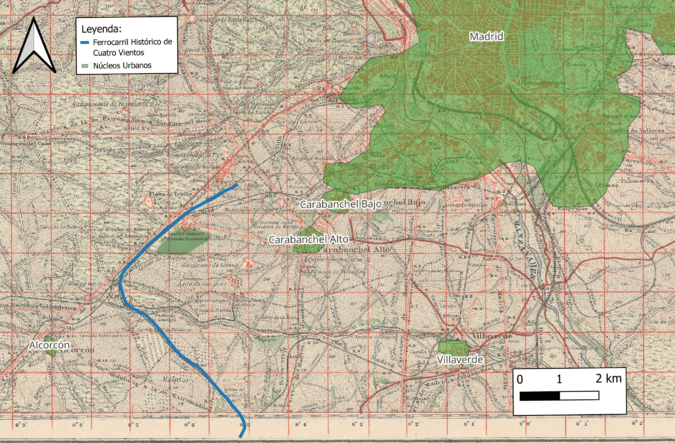 Sin embargo, el sector donde posteriormente se trazará el ferrocarril de Cuatro Vientos permanecía aún prácticamente sin infraestructuras modernas, configurando una amplia zona de transición rural entre los núcleos de Carabanchel, Leganés y Alcorcón. Esta situación de baja densidad constructiva y de escasa presión urbanística permitió, años después, la construcción de una infraestructura ferroviaria de carácter militar, que aprovechó esa continuidad territorial poco transformada.