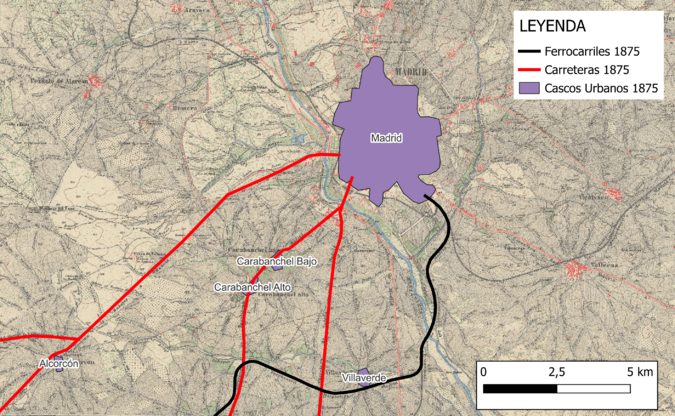 En el plano de 1875 que se muestra a continuación se observa cómo los principales núcleos urbanos eran Carabanchel Bajo, Carabanchel Alto, Villaverde, Alcorcón, y otros municipios que, por aquel entonces, eran localidades independientes, desconectadas funcionalmente del casco urbano de Madrid. Estos núcleos contaban con una economía predominantemente agrícola y una trama urbana concentrada y reducida.