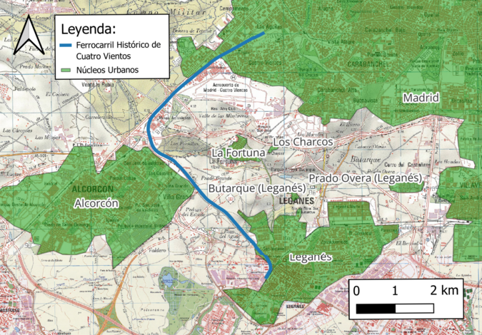 En primer lugar, se realizó un estudio histórico del Ferrocarril de Cuatro Vientos, determinando su trazado para conocer el área de estudio de este proyecto. El trazado, que discurre desde la actual estación de Cuatro Vientos aproximadamente hasta la estación de Leganés, atraviesa los términos municipales de Madrid, Alcorcón y Leganés. En los mapas históricos y actuales del IGN, el trazado se sitúa en las hojas cuyos nombres son "Madrid" y "Getafe".