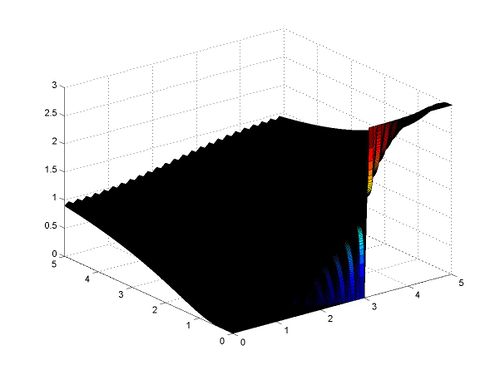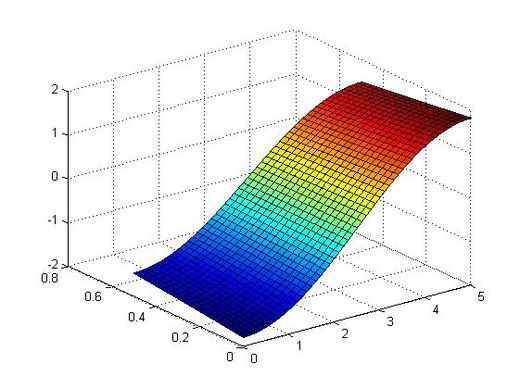 Si tomamos [math]\triangle t= \triangle x/4[/math] en [math]t\in\ [0,5][/math], con [math]\triangle x=0.1[/math]