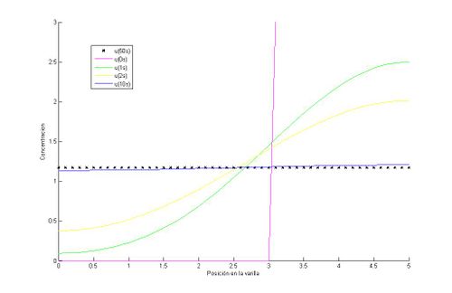 La concentración de la sustancia contaminante en la varilla varía con el tiempo, pero en un cierto momento esta concentración se va homogeneizando, y deja de variar, entrando en un estado estacionario:: [math] u_t(x,t)- Du_{xx}(x,t)=0 [/math] : [math] u_t(x,t)=0 \rightarrow Du_{xx}(x,t)=0 [/math] : [math] u=c_1x+c_2 [/math] Utizando Matlab comprobaremos que [math] c_1=0 [/math] [math] c_2=1.17 [/math] Para tiempos grandes la concentración se estabiliza en torno a 1.17 en toda la varilla, de forma que la solución se asemejará a una función lineal constante.