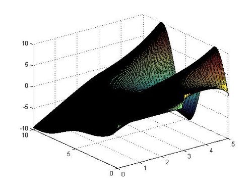 Las nuevas conciones de contorno son de tipo Neumann en el extremo izquierdo, lo que indica que se producirá un flujo de masa contaminante constante, 3, en ese extremo; y de tipo Dirichlet en el derecho, que nos indica que en ese extremo la cantidad de masa contaminante variará con el tiempo de forma periódica, entre los valores -10 y 10.