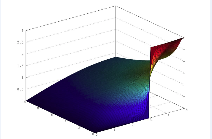 Cuyas condiciones iniciales son: [math] u(x,0)=\left\{\begin{matrix}\\0, x≤3\\3, x\gt3\end{matrix}\right. [/math]