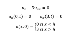 Resolvemos por el método de las líneas la ecuación diferencial con dos condiciones Newman que vienen dadas por la ausencia de flujo en los extremos del tubo. Empleamos también la condición inicial: u(x,0) = 2, si x ≤ 4, 4, si x > 4 y resolvemos matricialmente el sistema de N+1 incógnitas.