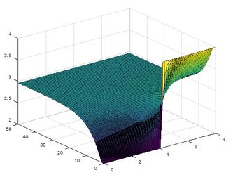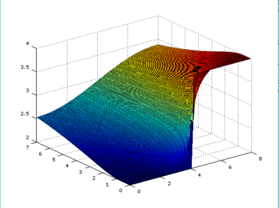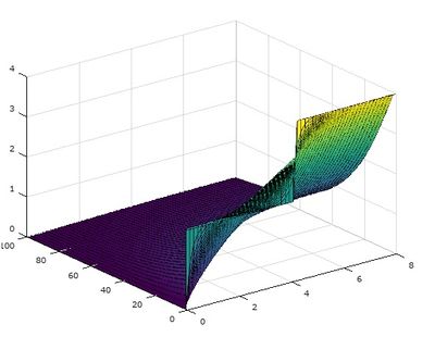 Por lo que podemos decir que el flujo es 0(muy próximo) y por la tanto la tanto la solución es homogénea siendo en cada instante y posición 2.9438. La función de la solución sería u(x,t)= 2.9438 cuando el tiempo es grande. Este estado estacionario se da cuando el flujo se aproxime a 0.