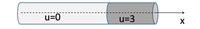 Suponemos que solamente se trata de una sustancia en suspensión, definimos su concentración con la variable [math] u (\frac{mol}{m^2})[/math], por unidad de superficie, constante en cada sección determinada del tubo. De esta forma, [math]u[/math] será una variable que exclusivamente dependerá de la sección tomada en el tubo , definida por [math]x \in(0,L)[/math], con [math]L [/math] como la longitud del tubo; y el tiempo [math]t \geq 0[/math], en que se encuentre. En este caso, consideraremos la longitud del tubo [math] L=5 [/math].