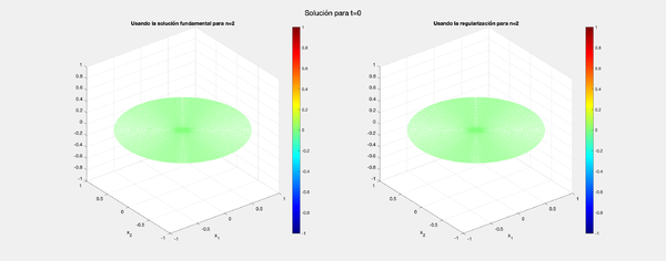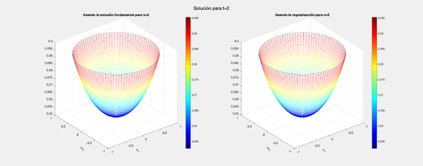 La solución se visualiza en dos subgráficos, uno utilizando la solución fundamental y otro utilizando la regularización para comparar los resultados. Este proceso se repite para cada tiempo especificado en el vector "tiempos".