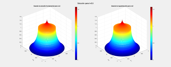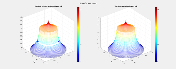 En primer lugar, para entender estas gráficas es imprescindible destacar el fenómeno que sucede en la representación para [math] t=0.5 [/math]. Para ello, debemos recordar que la solución fundamental en dos dimensiones presentaba una singularidad. Ese es el motivo por el que en la primera gráfica hay una franja en la que aparentemente la solución no está definida. De hecho, lo que está sucediendo en concreto es que para dichos puntos Matlab devuelve el valor NaN pues el denominador de la expresión se anula.