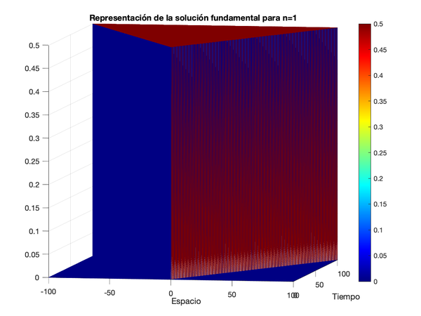 Con respecto al código, primero se define la solución fundamental en una dimensión además de los datos necesarios: puntos del espacio y tiempo iniciales y finales. Con ello, se define una discretización espacio-temporal y su correspondiente mallado. Por último, representamos la solución gráficamente e introducimos un comando para que nos guarde directamente la foto en el ordenador.