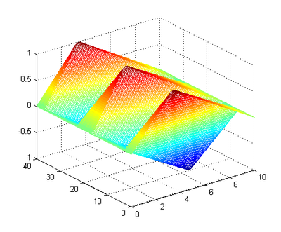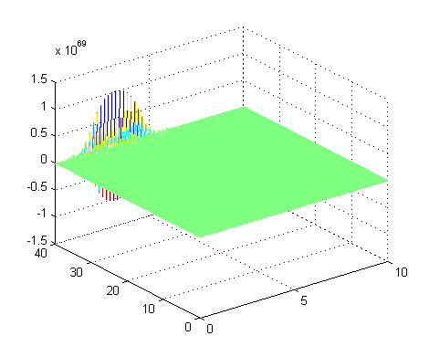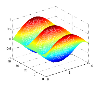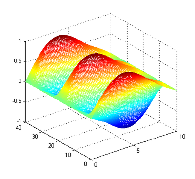 En la figura con ejes [math]Longitud-Tiempo-Posición[/math] se puede apreciar el desplazamiento del cable a lo largo de [math]L=10 m[/math] durante 40 segundos. Vemos que inicialmente el cable se sitúa 1 metro por encima de su posición de equilibrio en [math]x=10/3 m[/math]. Tras ello, su distancia vertical oscilará entre [math][1,-1][/math] a lo largo del tiempo. Esto es debido a la no presencia de fuerzas externas. Este método es muy adecuado para estos problemas.