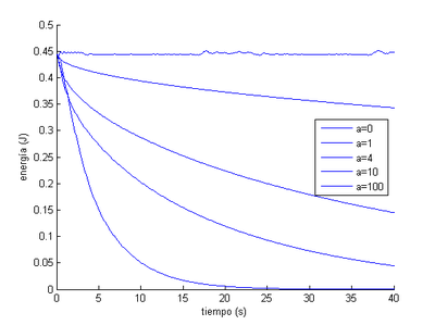 En la gráfica adjunta vemos cómo evoluciona el valor de la energía a lo largo del tiempo. Observamos además que existe una curva para cada valor de [math]a[/math] asignado a cada una de las iteraciones. De arriba a abajo los valores de [math]a[/math] son [math][0,1,4,10,100][/math]. Vemos que, a medida que aumenta la constante que representa la fuerza de amortiguamiento, la energía se disipa a mayor velocidad en relación a los anteriores valores.