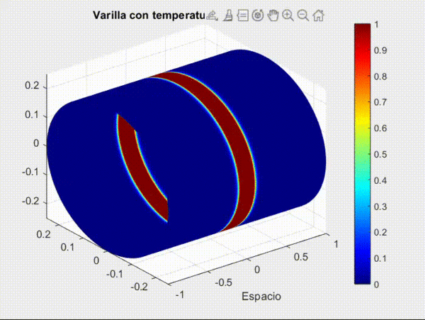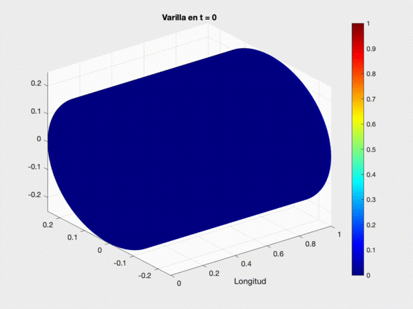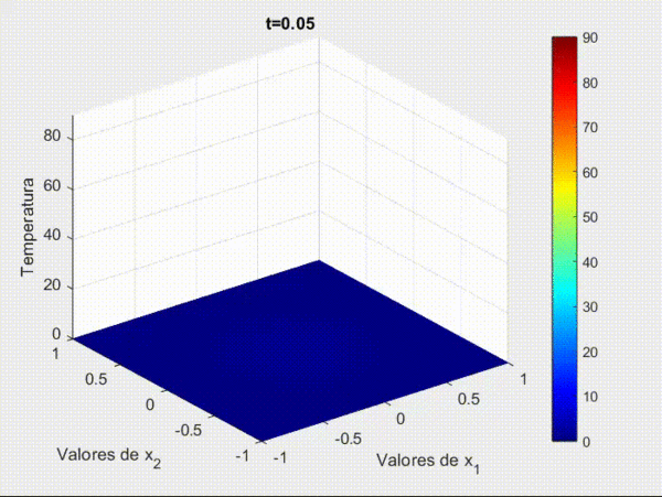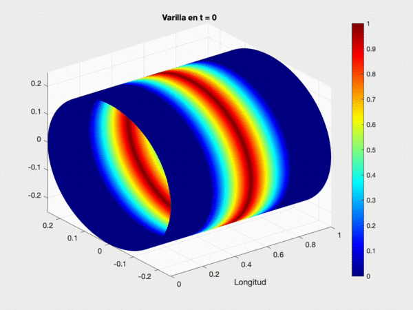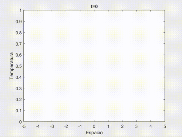 Como se puede observar en el vídeo, la varilla metálica está definida en el dominio espacial [math] [-1,1] [/math]. En el instante [math] t=0 [/math] se verifica la condición inicial y, por ello, toda la varilla comienza con una temperatura de [math] 1ºC [/math]. Con el transcurso del tiempo, el calor comienza a difundirse por el resto de la varilla. Es destacable que se ha establecido el tiempo de ejecución de manera que se reproduce mucho más lento y detallado los instantes de tiempo iniciales y, de una manera más rápida a medida que pasa el tiempo. Por último, la temperatura de la varilla tiende a estabilizarse a una temperatura nula.