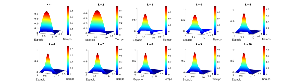 De esta manera, podemos dibujar la solución [math] u(x,t) [/math] en diferentes instantes de tiempo. Para ello, hemos implementado el siguiente código en Matlab: