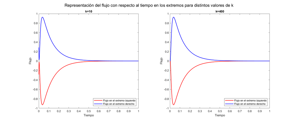 Finalmente, es imprescindible mencionar que esta gráfica es excelente a la hora de estudiar la convergencia de la solución a la solución estacionaria. El instante de tiempo en el que ambos flujos se estabilizan tomando el mismo valor simboliza que, en la varilla, el calor que entra por un extremo es el mismo que el que sale por el otro extremo, lo que obviamente es una consecuencia de haber alcanzado el estado estacionario.