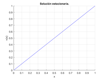 Para resolver esta EDP, en primer lugar se deben tener las condiciones frontera homogeneizadas, de manera que, [math] u(0,t)= 0, u(1,t)= 0 [/math]. Por tanto, primero se debe estudiar la solución estacionaria del problema. Para ello, se supondá que [math]{t \to \infty} [/math], en dicho caso, [math] u_{t} \approx 0[/math] y [math] u(x,t) \approx v(x)[/math].