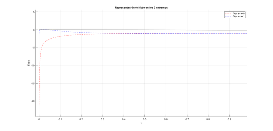 En el extremo izquierdo, el flujo inicial es nulo debido a la constancia de la temperatura en su entorno, pero a medida que avanza el tiempo, el flujo aumenta hasta estabilizarse en [math] q(0,t) = -1 [/math] . Este valor es igual al flujo en el otro extremo de la barra, sin embargo, su comportamiento en función del tiempo es contrario, aumenta hasta llegar a [math] q(1,t) = -1 [/math] .