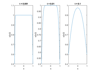 Para obtener una mayor visión de dicha solución, se representará en diferentes instantes de tiempo, [math] t \in (0.001, 0.01, 0.1) [/math] y en el espacio [math] x \in [-1,1] [/math]