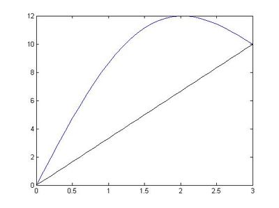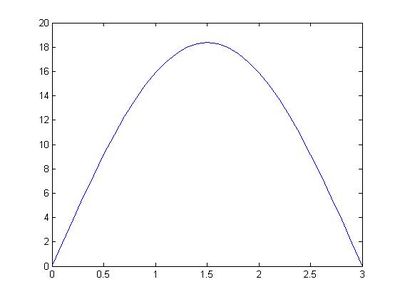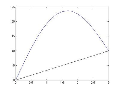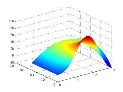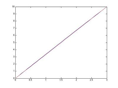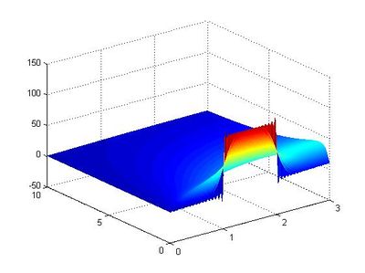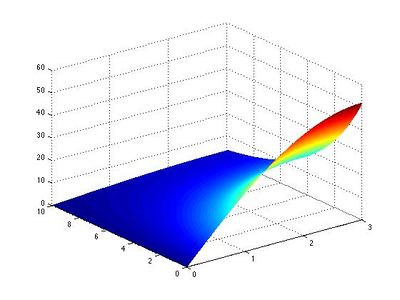 surf(xx,tt,yy)En este caso nos encontramos con unas condiciones iniciales diferentes, que consisten en una temperatura constante del aire de 16ºC. Esto quiere decir que tras un intervalo de tiempo suficientemente largo como para que se produzca un gran intercambio de calor, la temperatura de cada punto de la varilla no dependerá del instante en el que se mida. Sabemos de inicio que el extremo x=0 se encuentra a 0ºC y el x=3 se encuentra a 10ºC. Además, estando el entorno a 16ºC, la temperatura en cada punto de la varilla a partir del instante en que se vuelve estacionaria seguirá una función que hemos calculado resolviendo la ecuación diferencial resultante de igualar el término u_t a 0. Así, obtenemos la ecuación siguiente: