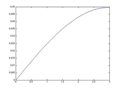 En la segunda gráfica se representan los valores que toma la temperatura de todos los puntos de la varilla en el instante obtenido como comienzo del estado estacionario (t=2,525). Se puede apreciar que en ningún momento superan el valor 0,05, lo que nos permite afirmar que a partir de ese momento comienza el estado estacionario con un error del 5%.