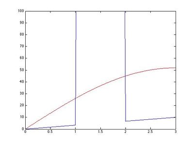 [math] u_0(x)= \begin{cases} 10x/3 & \mbox{si} & x \in \mbox{(0,1)}\cup\mbox{(2,3)} \\ 100 & \mbox{si} & x \in \mbox{(1,2)} \end{cases} [/math]