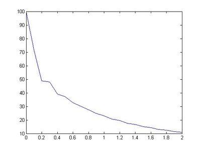 plot(t,U(:,15))En la primera gráfica se observa la diferencia de temperatura en la barra debido a las condiciones iniciales y cómo va disminuyendo su temperatura con el paso del tiempo. Como se aprecia en la gráfica de la derecha, el punto medio de la barra sufre una disminución en la temperatura a lo largo del tiempo. Hay un descenso de la temperatura mas acentuada en los primeros instantes, que se debe al contraste existente entre la barra y el entorno, el cual actúa como sumidero de calor. En ambas representaciones se ven unos picos o asientos térmicos que pueden ser debidos a la inexactitud del método empleado. Con un paso en el tiempo menor y un mayor intervalo, estos errores son menos apreciables.