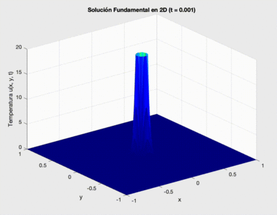 title(['Solución Fundamental en 2D (t = ' num2str(t_values(i)) ')']);