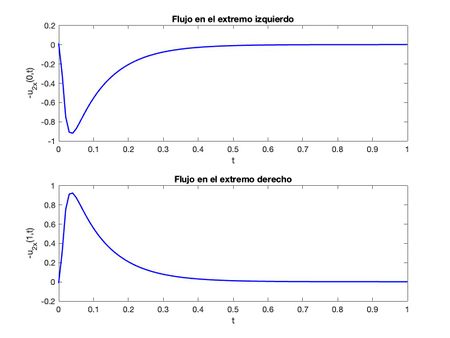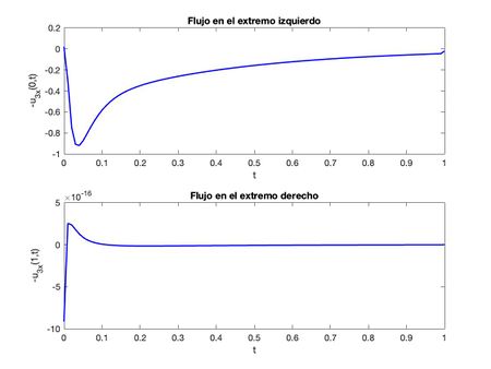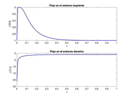 - También llama la atención que ambas gráficas se acaban estabilizando en un flujo de -1, este punto coincide con el punto en el que la solución alcanza la solución estacionaria, por lo que tiene sentido que el flujo en ambos extremos se estabilice en el mismo valor.
