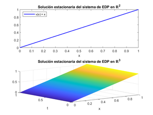 La resolución del sistema anterior se basa en el método de separación de variables perteneciente a la teoría de resolución ecuaciones diferenciales, lo cual carece de interés en este documento. Por limpieza en la lectura, este procedimiento no se incluirá, si embargo, hay un paso previo al método que cabe incluir. La resolución por separación de variables requiere que el sistema sea homogéneo. Esta modificación en el sistema original la conseguimos haciendo uso de la que se conoce como solución estacionaria. Esta se alcanza cuando ha pasado un tiempo infinito ([math] t \rightarrow \infty [/math]) y considerando por tanto, que el flujo del calor ha dejado de depender del tiempo, [math] u(t,x) \sim v(x) [/math]. Haciendo los respectivos cálculos es fácil llegar a que la solución estacionaria es [math] v(x)=x [/math] con [math] x\in[0,1] [/math]. La cual gráficamente muestra una bajada de temperatura en el espacio y tiempo.