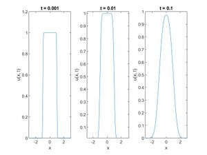 Sea la condición inicial u0(x)=1[-1,1], la solución a la ecuación anterior viene dada por la convolución siguiente, donde K(x,t) es la solución fundamental explicada en apartados anteriores: