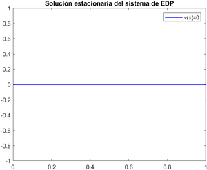 Teniendo que las condiciones frontera son nulas, se tiene que la solución estacionaria [math]v(x)=0 [/math]. Por lo que la solución del problema es: