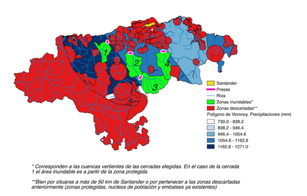 Todas las zonas tienen en común: Ninguna se sitúa en una zona próxima a embalse pues no entran en el buffer de los 5 kilómetros de proximidad a cualquier embalse preexistente. Todas están en el radio de influencia de 50 kilómetros de Santander y respetan las zonas protegidas. Además todas ellas se ubican geográficamente en zonas de lluvias abundantes.