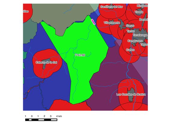 Dado que el BTN 100 nos proporcionaba información de toda España,hemos eliminado todas las unidades administrativas a excepción de la de Cantabria(desde la tabla de atributos). Posteriormente hemos intersecado dicha unidad con el resto de las capas del BTN 100 que necesitábamos (zonas protegidas, nucleos urbanos, embalses y ríos) para extraer sólo los datos de Cantabria. Para continuar hemos realizado los buffers ya mencionados anteriormente en el apartado de metodología,luego hemos unido todas las capas en una capa vectorial para descartar territorios no válidos. Para conseguir las cuencas vectoriales y las pendientes hemos cargado el MDT200 de la zona de Cantabria en Grass y hemos usado las funciones: r.watershed (cuencas) y r.slope (pendientes) Desde la IDE de Cantabria nos hemos descargado nueve hojas del suelo geológico en vectorial y hemos usado el comando combinar para juntar las distintas capas en una sola.