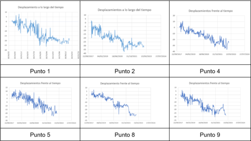 En el contexto del análisis de los movimientos de los edificios a lo largo del tiempo, se ha analizado desde la correlación que a medida que la velocidad de cambio aumenta, también lo hacen los asentamientos en los edificios. Este fenómeno se presenta en el mapa, el cual se clasifican distintos puntos para investigar su comportamiento con mayor detalle. En este estudio, se pone el foco en dos compartimientos principales. Por un lado, se analizan los puntos donde se observa una tendencia de descenso de la posición de los edificios a lo largo del tiempo. Por otro lado, se examinan los puntos donde se registra un aumento de elevación de los edificios en el mismo periodo. A continuación, se muestran los desplazamientos a lo largo del tiempo en las tablas siguientes. Los puntos están definidos de sur a norte, tal como se indica en el mapa adjunto.
