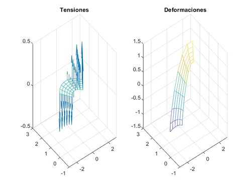 La máxima tensión que puede presentar el cuarto de anillo antes de iniciar su deformación plástica bajo estas condiciones es 2.8428 y se alcanza en su centro. Para una mejor comprensión y visualización se representan las tensiones en Matlab: