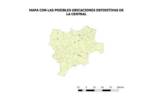 De estos dos planos obtenidos, se obtiene el resultado final del estudio. Consiste simplemente en tomar el plano de situaciones favorables y eliminar aquéllas que coincide su ubicación con una posible zona no apta para el emplazamiento de la central. Para ello, mediante QGis se tiene que realizar anteriormente una capa intersección de los criterios favorables y desfavorables. Esta nueva capa es la que es la que se le resta a la capa de las zonas aptas. De este modo se obtiene el siguiente plano, con el que finalizaría el estudio, ya que los resultados obtenidos cumplen los criterios de viabilidad y localización expuestos al principio, y necesarios para cumplir con el objetivo del presente trabajo.