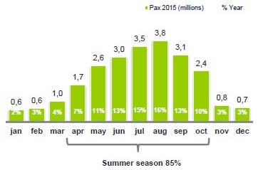 Estos números suponen un incremento del 2,7% en pasajeros respecto al año anterior y del 12,4% respecto a 2010 (año de la crisis económica en que hubo menos pasajeros). Además, los pasajeros se concentran en los meses de verano, llegando a los 3,8 millones solo en agosto de 2015.